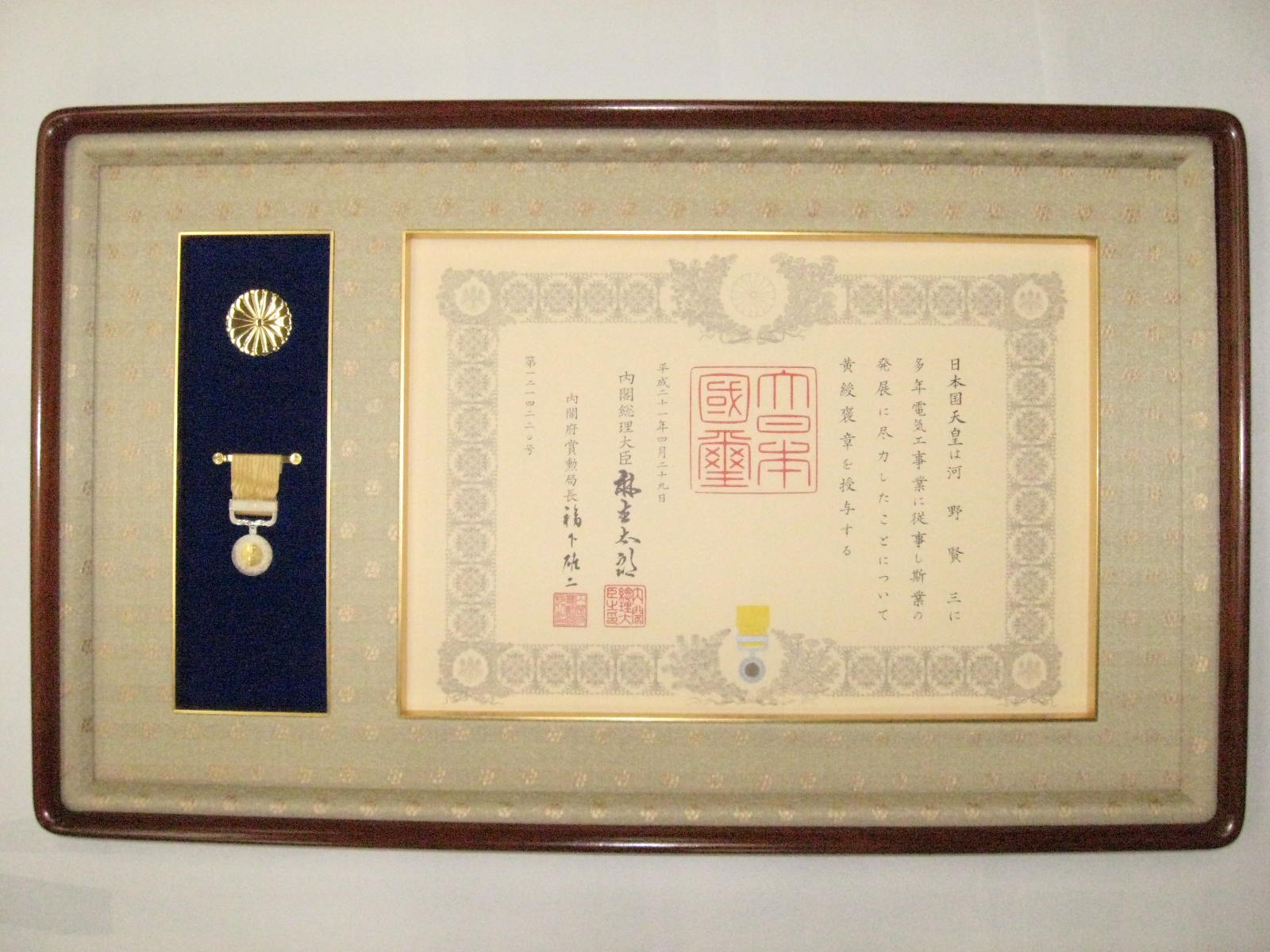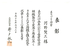 平成21年「春の褒章」において、河野賢三(故 取締役会長)が黄綬褒章を受章いたしました。黄綬褒章は、永年に亘り業務に精励し、衆民の模範となる方に対し、黄色の綬と共に授与されます。
